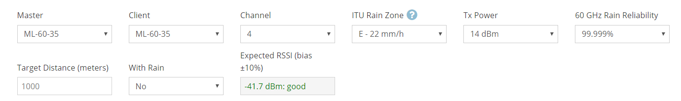 If yes is selected from the ‘With Rain’ drop-down menu, the ‘Expected RSSI’ output shows the RSSI levels for the input ‘Target Distance’ that should be exceeded the percentage of time selected in the ‘60 GHz Rain Reliability’ menu.
